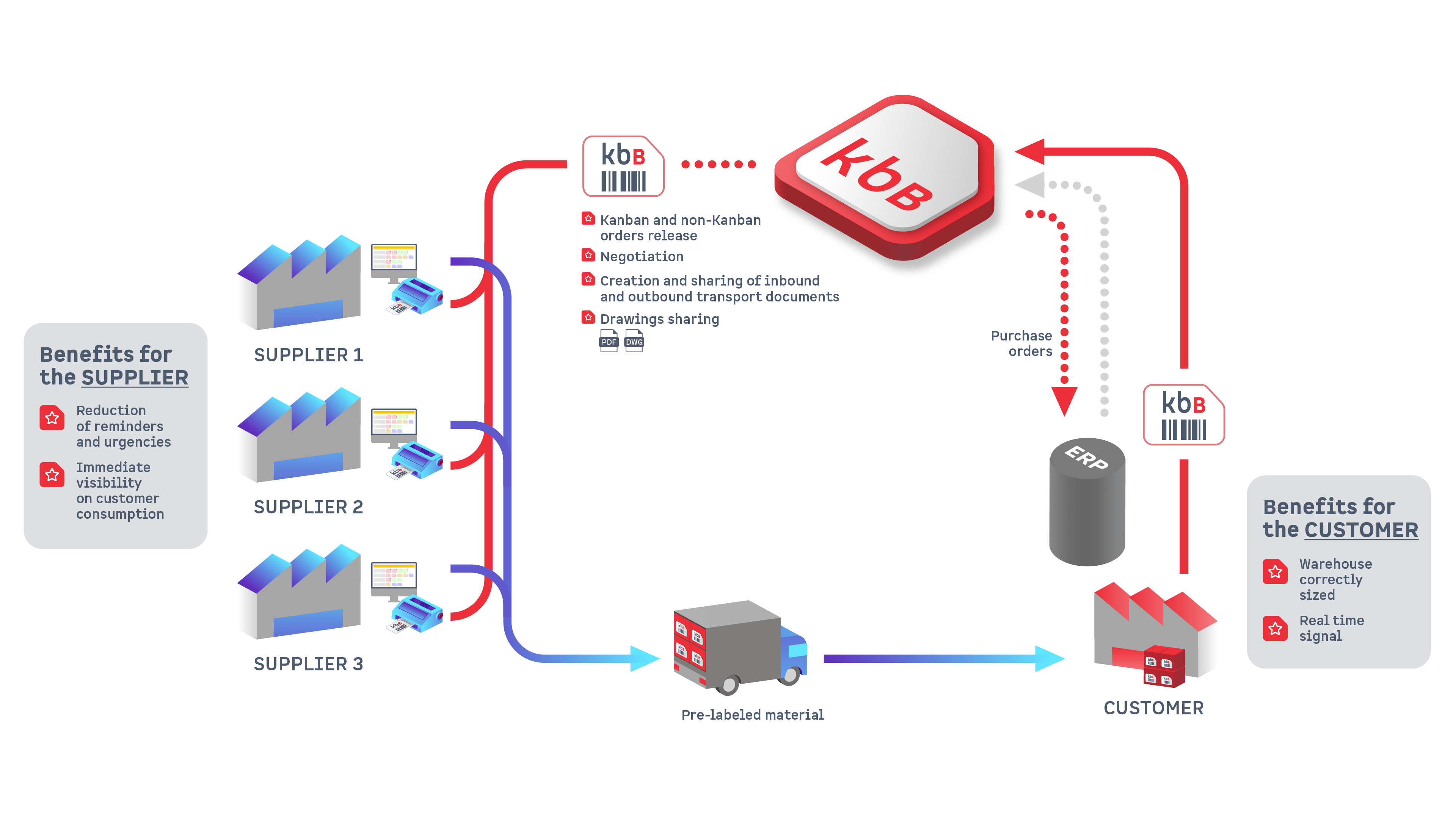 Wenn ein Unternehmen zahlreiche Artikel von seinen Lieferanten kaufen muss, ist es wichtig, ein Tool zu verwenden, das eine Reduzierung der Lagerbestände und der Verwaltungskosten der Bestellung auf ein Minimum erlaubt, ohne dass die Gefahr von Out-Of-Stocks besteht. KanbanBOX erlaubt eine Vereinfachung und Automatisierung des Informationsaustauschs mit den Lieferanten und eine konstante Anpassung der der Kanban-Menge immer auf einer Linie mit der Nachfrage auf dem Markt. Entscheiden Sie sich für eKanban von KanbanBOX!