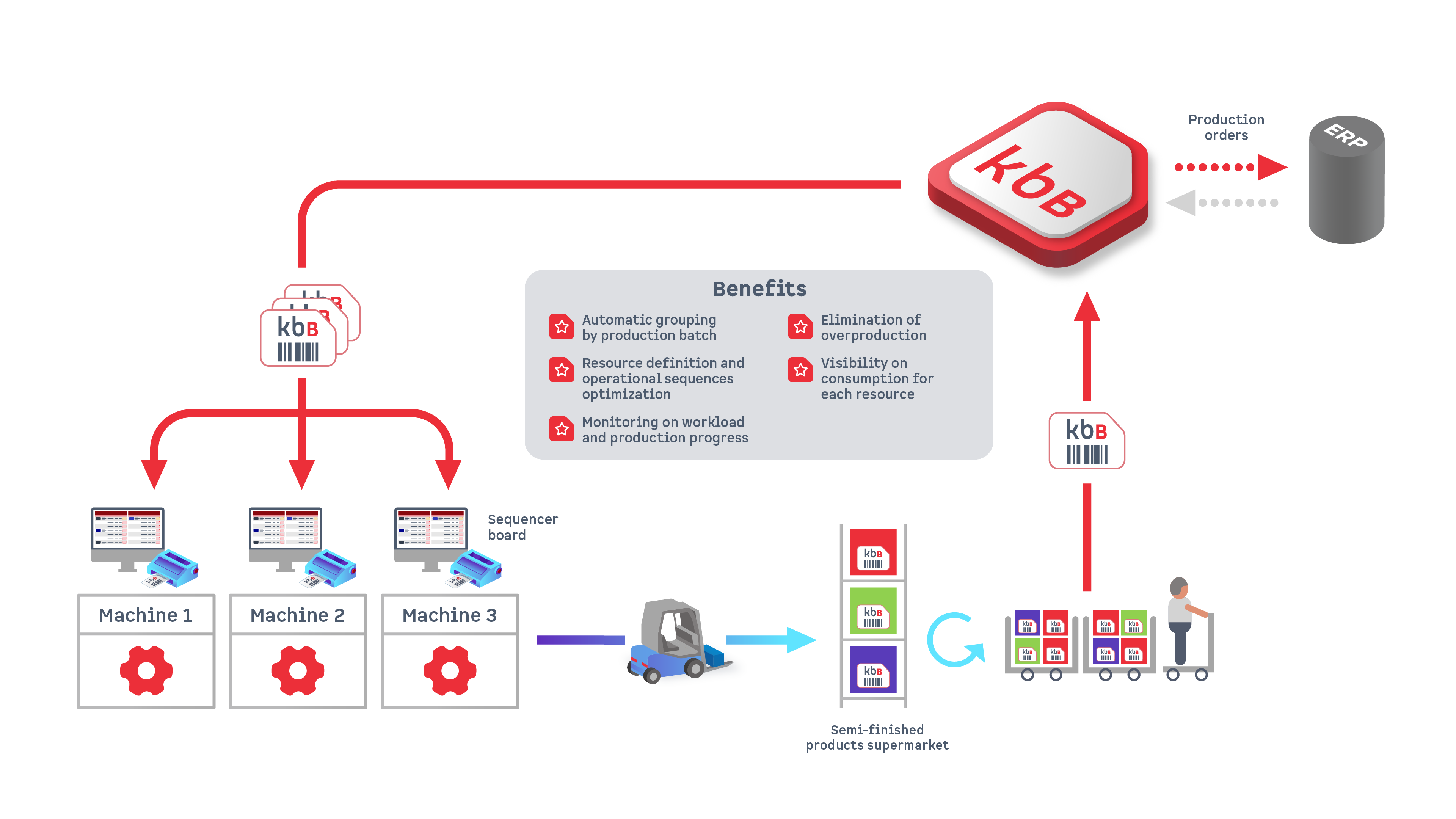 - auf einfache und intuitive Weise die Produktion der Materialien mit Kanban zusammen mit den Fertigungsaufträgen steuern.