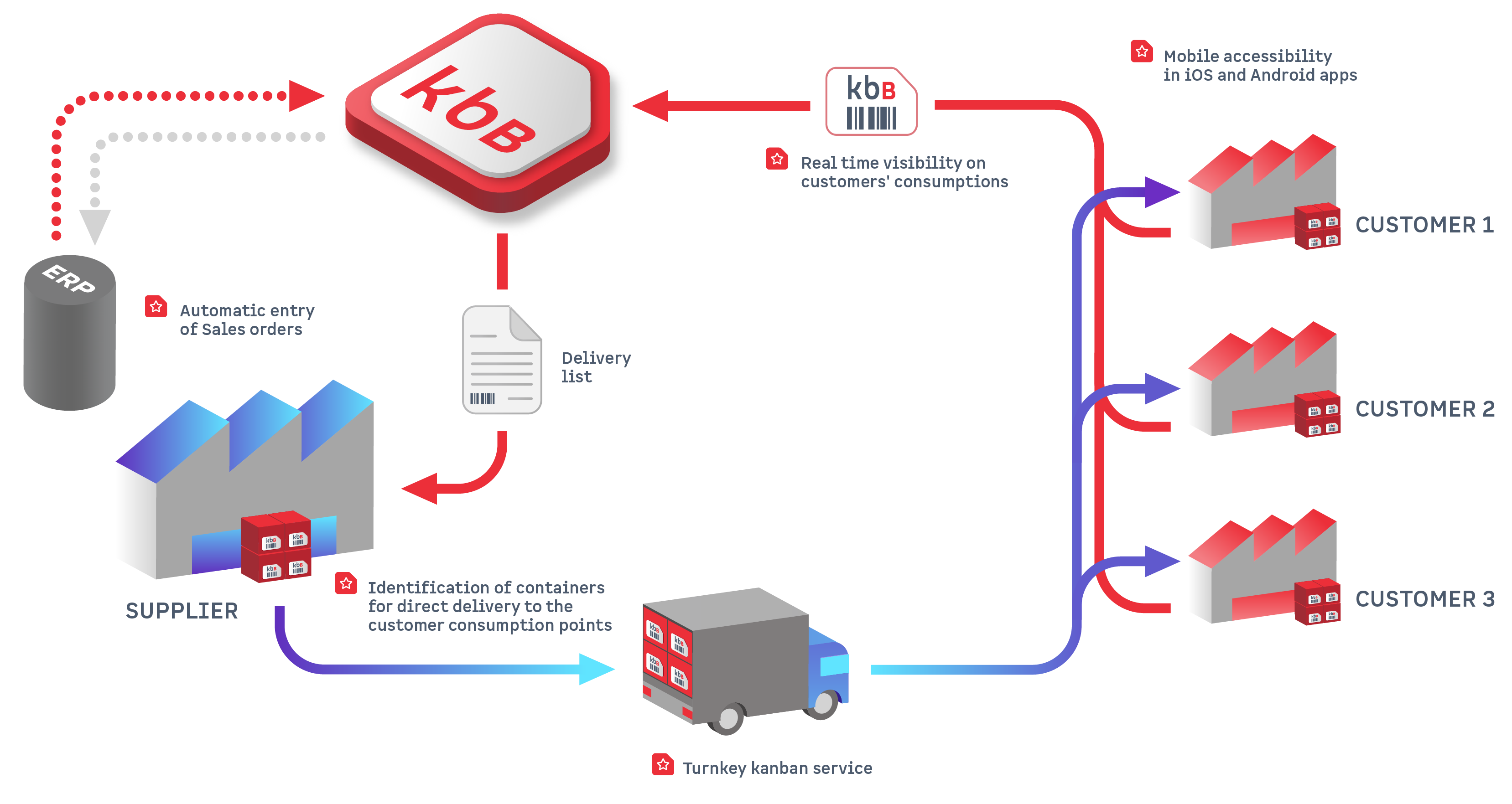 Le kanban électronique de KanbanBOX permet d’acquérir une visibilité sur la consommation du client et d’automatiser le cycle de rétablissement des matériaux.