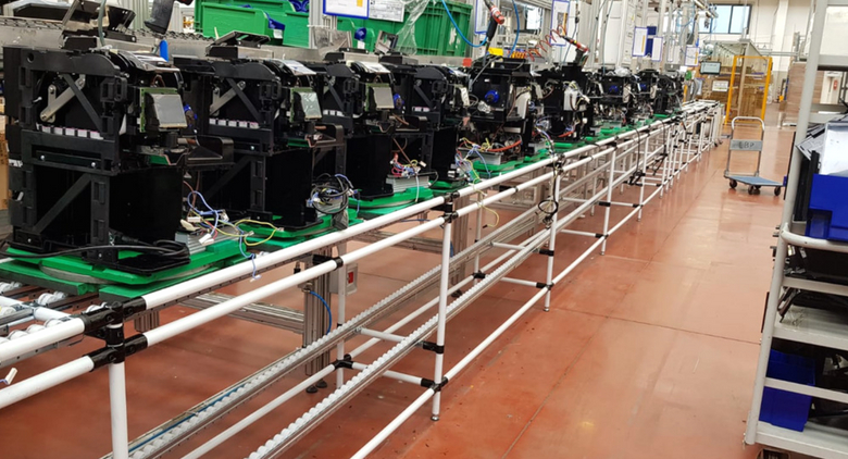 Nella definizione del sistema più adatto a gestire questa parte del processo, è bene tenere a mente che la gamma di produzione degli OCS in esame, richiedeva la gestione di un numero molto elevato di componenti, impossibile da mantenere tutti direttamente in linea. Per questo l’asservimento materiali è stato organizzato, tramite l’utilizzo di KanbanBOX, in modalità di Pull sequenziale: i kit di contenitori vengono preparati e consegnati dal Magazzino solo quando richiamati dai cartellini kanban, sincronizzati con ogni pitch di produzione.