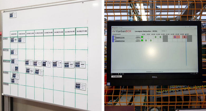 Per questo motivo, i kit vengono predisposti con un giorno di anticipo rispetto alla produzione, seguendo la programmazione definita nella lavagna Heijunka, all’interno di un orizzonte congelato.