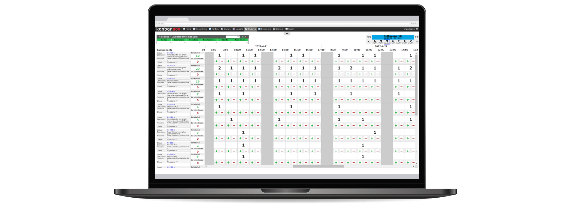 A parità di celle di lavoro, il modulo Heijunka di KanbanBOX distribuisce su un dato periodo di tempo il lavoro e le risorse impiegate, permettendoti di produrre ogni giorno le stesse quantità e lo stesso mix/varietà di produzione.