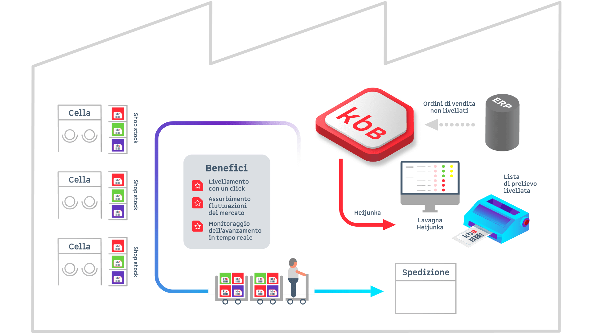 Inoltre, grazie al kanban multiprocesso, gli avanzamenti nella lavagna Heijunka possono tirare processi a monte sincronizzati, come preparazione di kit di componenti e pre-assemblaggi.