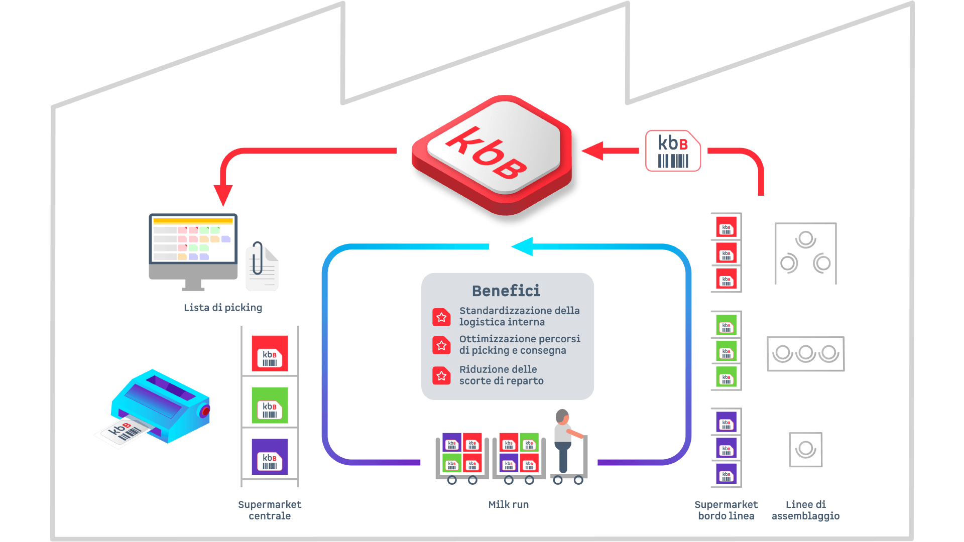 Nel pieno rispetto delle logiche kanban, le attività di approvvigionamento delle diverse postazioni risultano mirate per le effettive necessità , trasportando e consegnando solo ciò che serve quando serve